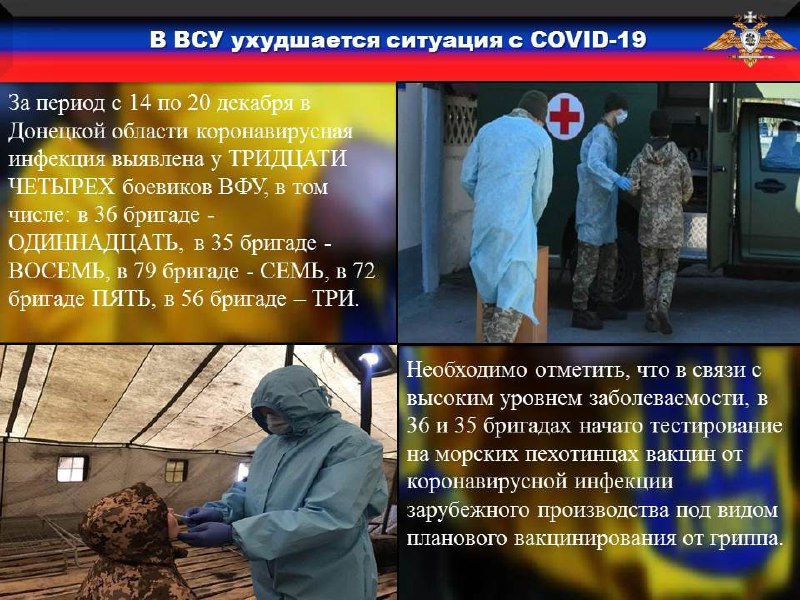 ♦️За период с 14 по 20 декабря в Донецкой области коронавирусная инфекция выявлена у ТРИДЦАТИ ЧЕТЫРЕХ боевиков ВФУ, в том числе: в 36 бригаде - ОДИННАДЦАТЬ, в 35 бригаде - ВОСЕМЬ, в 79 бригаде - СЕМЬ, в 72 бригаде ПЯТЬ, в 56 бригаде – ТРИ.