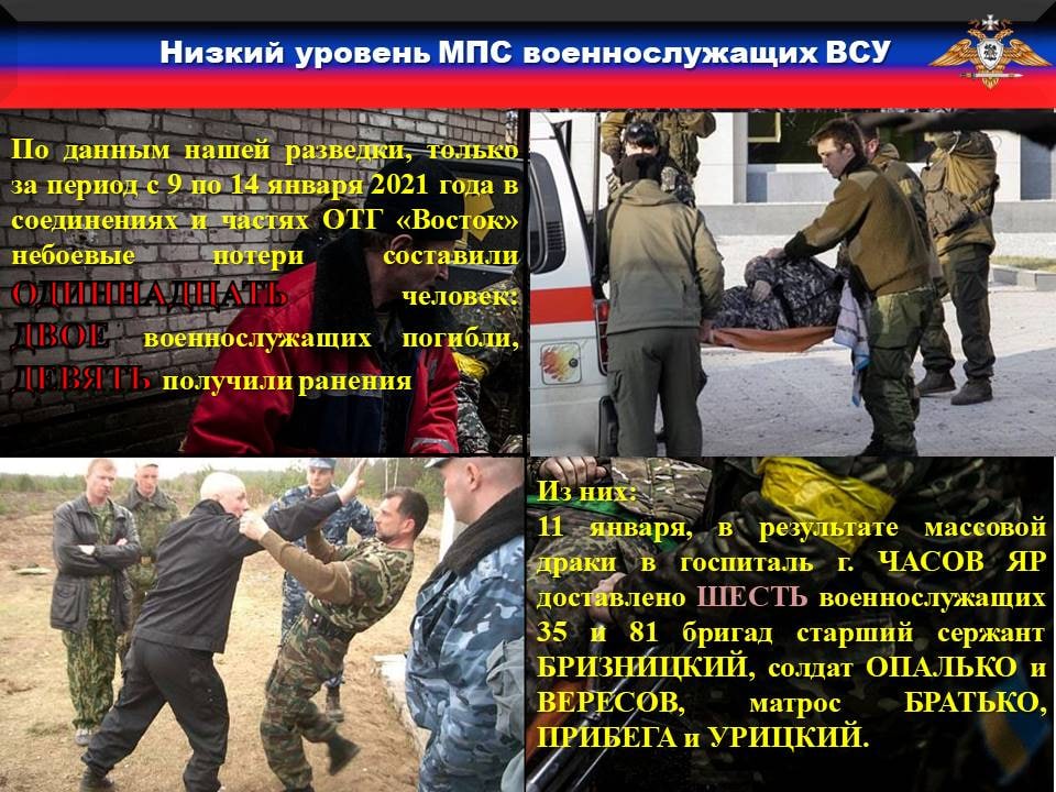 ♦️По данным нашей разведки, за период с 9 по 14 января 2021 года в соединениях и частях ОТГ «Восток» небоевые потери составили ОДИННАДЦАТЬ человек: ДВОЕ военнослужащих погибло, ДЕВЯТЬ получили ранения, из них: