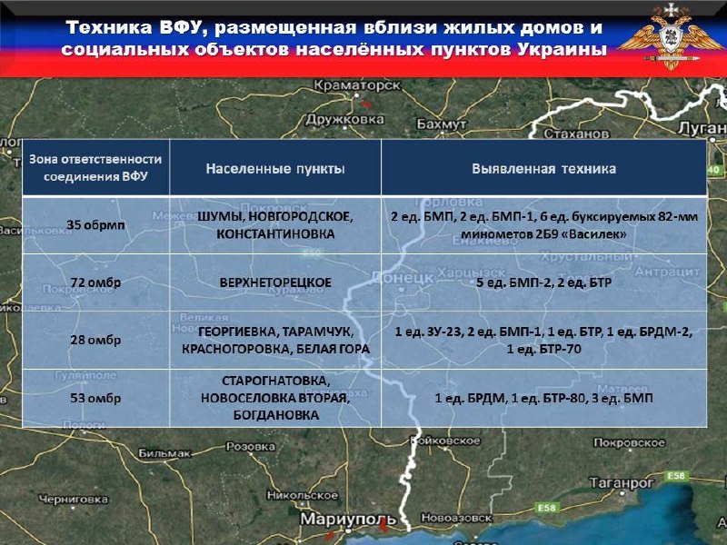 🚫Противник продолжает подвергать опасности жизнь и здоровье мирных жителей, размещая вооружение и технику в населённых пунктах. В нарушение ТРЕТЬЕГО пункта дополнительных мер, предусматривающего запрет на размещение вооружения в населенных пунктах и их окрестностях, за прошедшую неделю вскрыто ДВАДЦАТЬ ВОСЕМЬ единиц вооружения и военной техники подразделений ОТГ «Восток»: