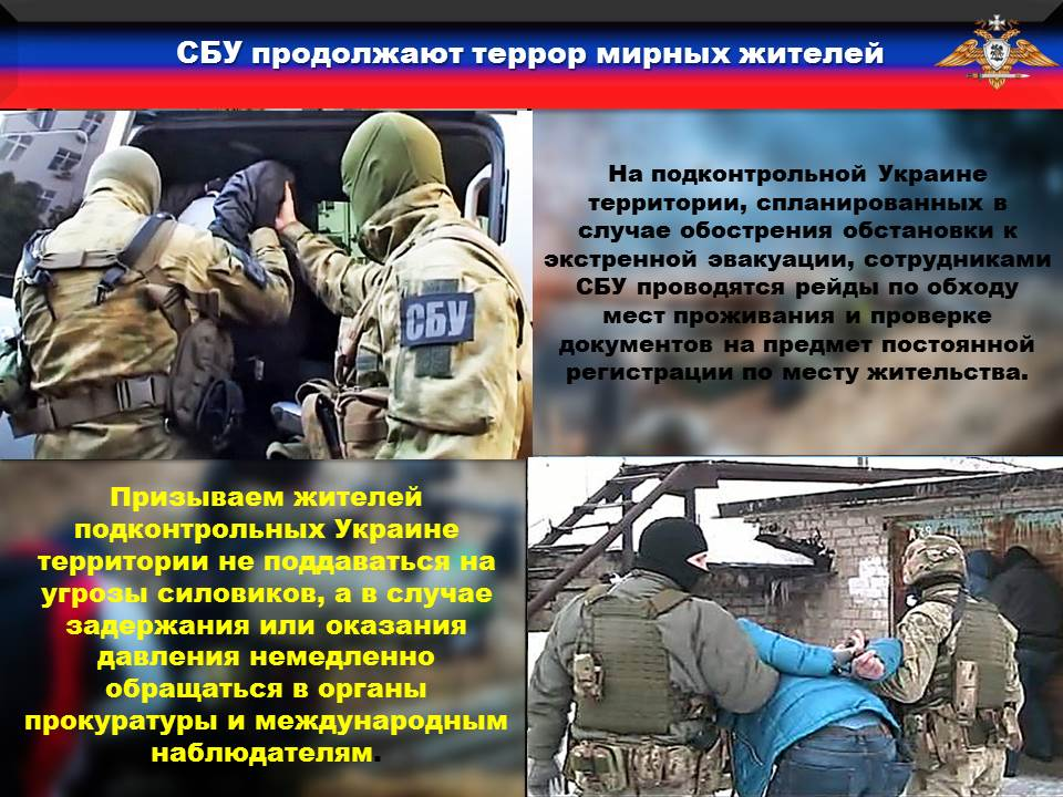 🦇По данным наших источников на территории Донецкой области под предлогом составления списков постоянно проживающих на подконтрольной Украине территории, спланированных в случае обострения обстановки к экстренной эвакуации, сотрудниками СБУ проводятся рейды по обходу мест проживания и проверке документов на предмет постоянной регистрации по месту жительства. В случае выявления граждан, у которых родственники проживают на территориях Республик, им предлагается передавать информацию о местах дислокации воинских частей, передвижения колонн техники и проводимых мероприятиях в соединениях и частях НМ. Отказавшихся сотрудничать задерживают и обвиняют в пособничестве сепаратистам.