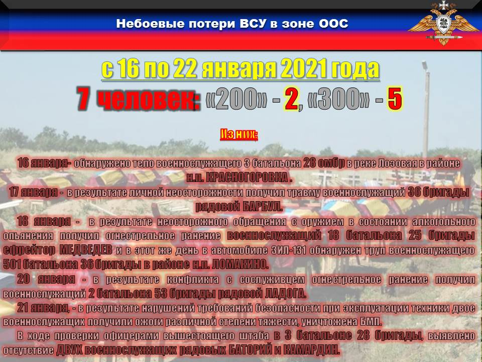➖18 января, в результате неосторожного обращения с оружием в состоянии алкогольного опьянения получил огнестрельное ранение военнослужащий 18 батальона 35 бригады ефрейтор МЕДВЕДЕВ;