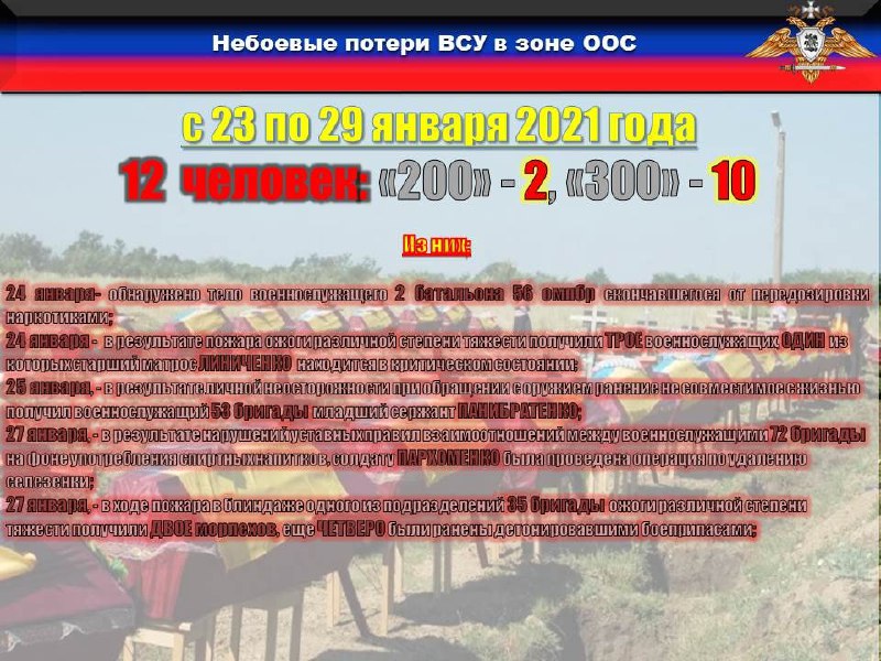 ♦️По имеющимся у нас данным, за период с 23 по 29 января 2021 года в соединениях и частях ОТГ «Восток» небоевые потери составили ДВЕНАДЦАТЬ человек, из которых ДВОЕ военнослужащих погибли, ДЕСЯТЬ получили ранения и травмы: