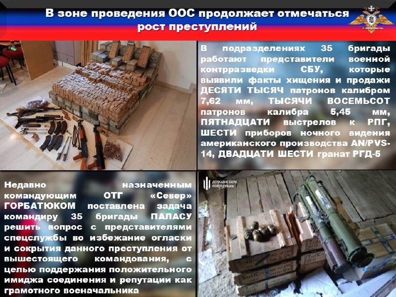 ♦️По данным нашей разведки в подразделениях 35 бригады работают представители военной контрразведки СБУ, которые выявили факты хищения и продажи ДЕСЯТИ ТЫСЯЧ патронов калибром 7,62 мм, ТЫСЯЧИ ВОСЕМЬСОТ патронов калибра 5,45 мм, ПЯТНАДЦАТИ выстрелов к РПГ, ШЕСТИ приборов ночного видения американского производства AN/PVS-14, ДВАДЦАТИ ШЕСТИ гранат РГД-5.