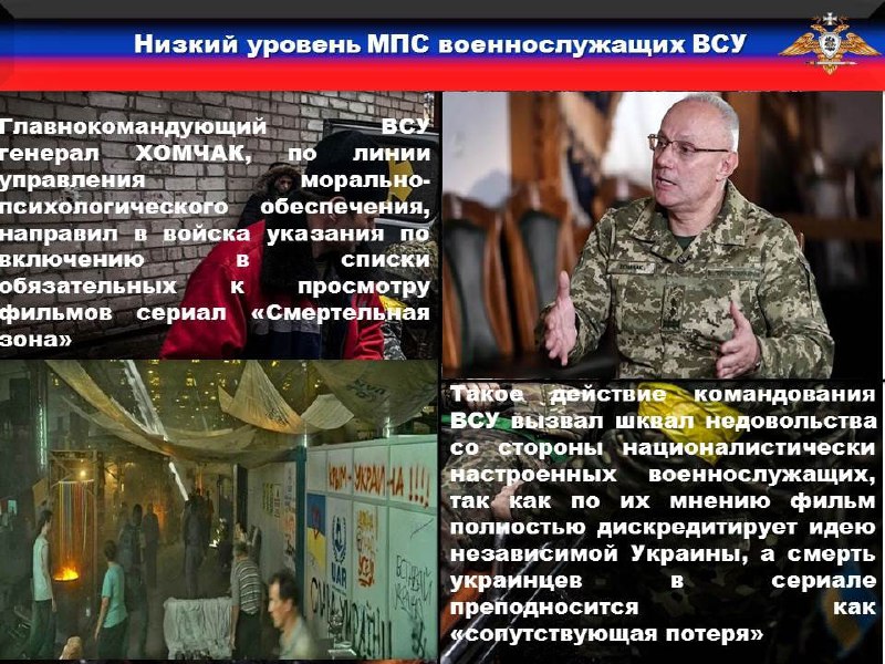 ♦️Стало известно, что главнокомандующий ВСУ генерал ХОМЧАК, по линии управления морально-психологического обеспечения, направил в войска указания по включению в списки обязательных к просмотру фильмов сериал «Смертельная зона» производства американской компании «Нетфликс». Действие картины происходит в 2036 году, а в основу сюжетной линии заложена борьба украинских и американских военнослужащих с пророссийскими повстанцами на территории Украины.