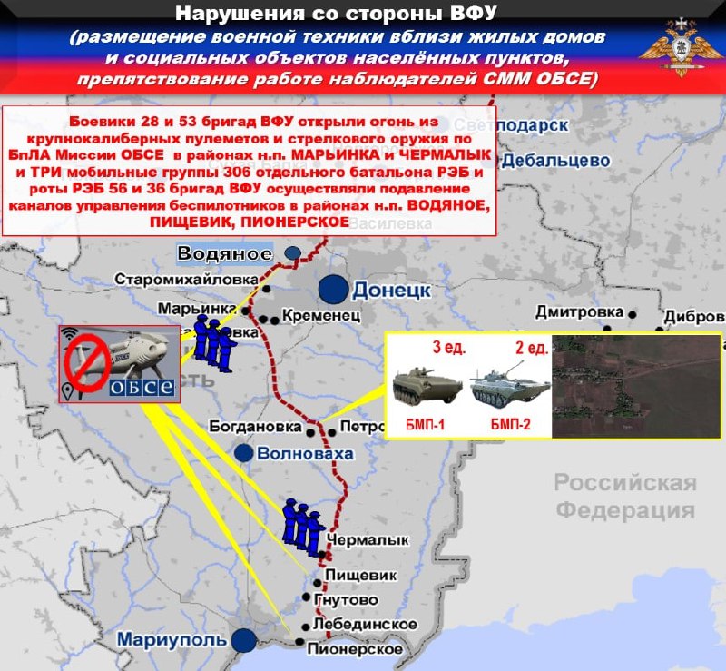 ➖На Мариупольском направлении, боевики с позиций батальона морской пехоты 36 бригады ВФУ, в нарушение ВТОРОГО пункта дополнительных мер, в районе н.п. ВОДЯНОЕ обстреляли район н.п. ЛЕНИНСКОЕ совершив ДВА выстрела из БМП-1.