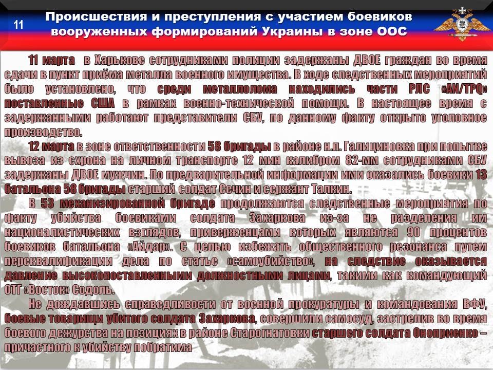 В 53 механизированной бригаде продолжаются следственные мероприятия по факту убийства боевиками солдата Захаркова из-за не разделения им националистических взглядов, приверженцами которых являются 90 процентов боевиков батальона «Айдар». С целью избежать общественного резонанса путем переквалификации дела по статье «самоубийство», на следствие оказывается давление высокопоставленными должностными лицами, такими как командующий ОТГ «Восток» Содоль.