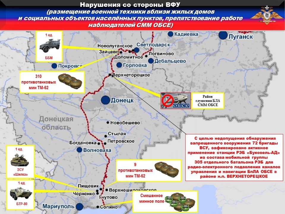 ❗️Украинская сторона по-прежнему препятствует работе Международных наблюдателей. Так, с целью недопущения фиксации запрещенного вооружения 72 бригады ВСУ, зафиксировано применение станции радиоэлектронного подавления каналов управления и навигации БЛА «Буковель-АД» из состава мобильной группы 305 отдельного батальона РЭБ ВФУ в районе н.п. ВЕРХНЕТОРЕЦКОЕ, во время работы которой, оператор воздушного аппарата международной Миссии на 30 минут утерял управление беспилотником. Стоит отметить, что при повторной попытке запуска БЛА СММ ОБСЕ в данном районе, беспилотник вновь подвергся радиоэлектронному воздействию. Учитывая осведомленность украинской стороны о районе и времени работы Миссии, действия подразделений ВСУ по препятствованию работе наблюдателей ОБСЕ имеют умышленный характер.
