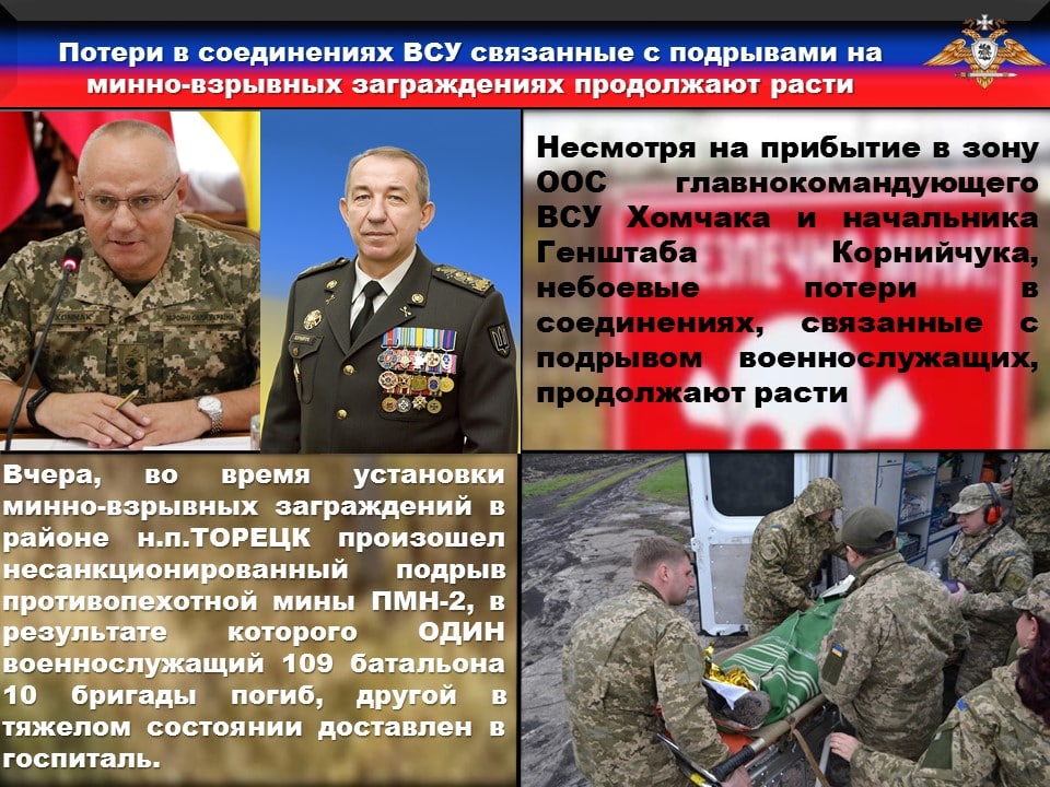 ❗️Несмотря на прибытие в зону ООС главнокомандующего ВСУ Хомчака и начальника Генштаба Корнийчука, небоевые потери в соединениях, связанные с подрывом военнослужащих, продолжают расти Так, вчера во время установки минно-взрывных заграждений в районе н.п.ТОРЕЦК произошел несанкционированный подрыв противопехотной мины ПМН-2, в результате которого ОДИН военнослужащий 109 батальона 10 бригады погиб, другой в тяжелом состоянии доставлен в госпиталь. Примечательным является то, что произошедший инцидент командир бригады не смог скрыть от вышестоящего командования, так как данный факт был заснят на стационарную камеру видеофиксации, съемка с которой была оперативно изъята комиссией Генерального штаба.