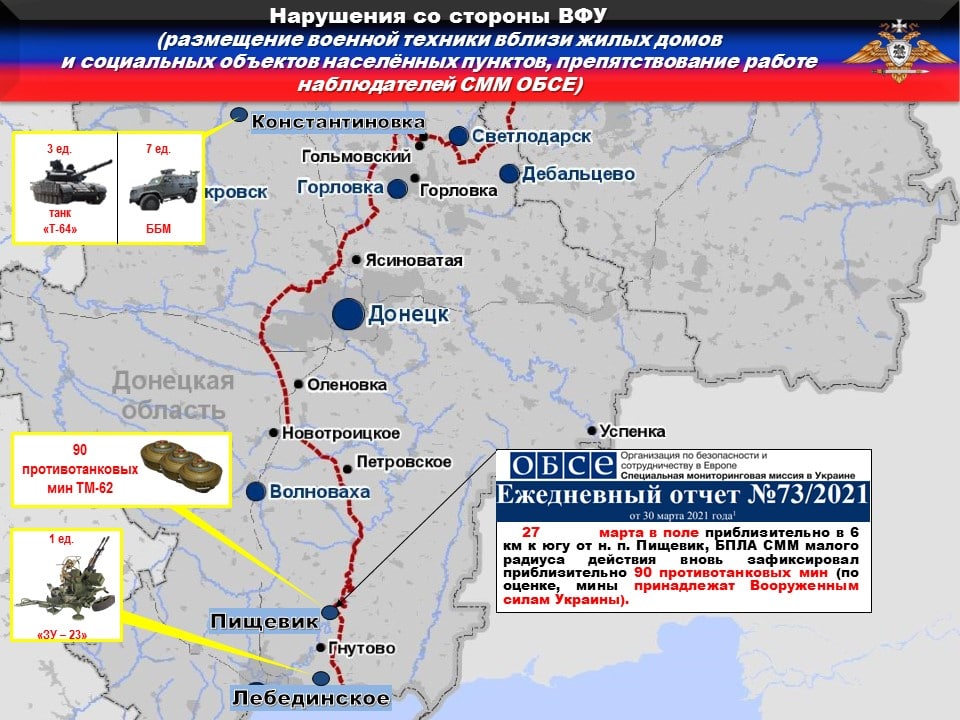 В этой связи следует отметить, что в преддверии окончания срока действия мандата ОБСЕ 31 марта 2021 года и видеоконференции лидеров России, Германии и Франции, на которой планируется к обсуждению вопрос ситуации на Донбассе, украинская сторона активизировала проведение мероприятий по сокрытию фактов нарушений Минских соглашений, в частности по отводу техники и применению тяжелого вооружения.