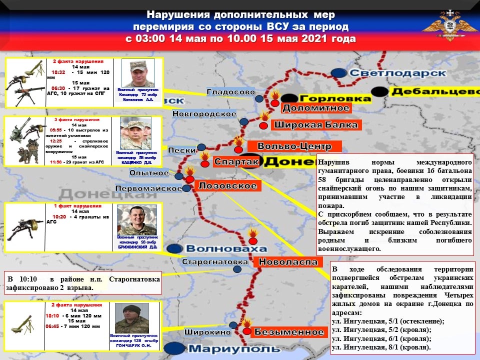 💥За прошедшие сутки с 15 на 16 мая со стороны украинских боевиков зафиксировано ВОСЕМЬ нарушений ВТОРОГО пункта Комплекса дополнительных мер по контролю за соблюдением режима прекращения огня.