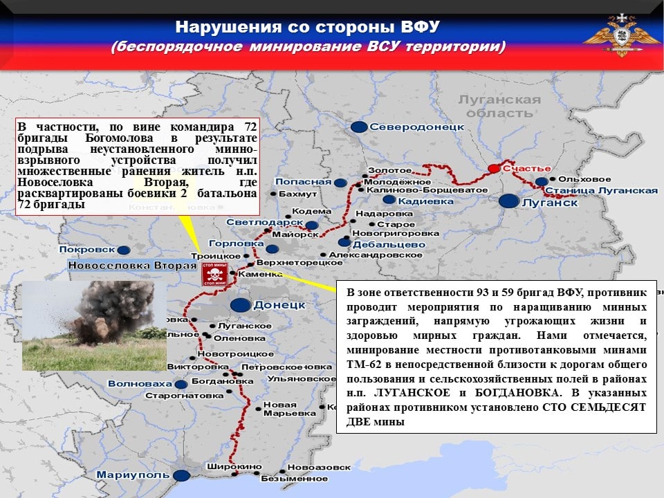 В частности, по вине командира 72 бригады Богомолова в результате подрыва неустановленного минно-взрывного устройства получил множественные ранения житель н.п. Новоселовка Вторая, где расквартированы боевики 2 батальона 72 бригады.