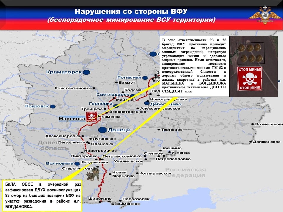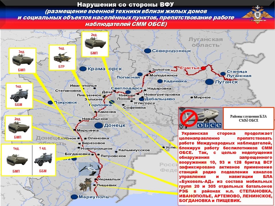 ⛔️С целью недопущения обнаружения запрещенного вооружения подразделений ВСУ, а также сокрытия фактов проведения инженерных работ по совершенствованию позиций, украинская сторона продолжает активно использовать подразделения РЭБ в зоне ООС, блокируя работу беспилотников СММ ОБСЕ. Так, в зоне ответственности 10, 93 и 128 бригад ВСУ зафиксировано применение станций радио подавления каналов управления и навигации БЛА «Буковель-АД» из состава мобильных групп 20 и 305 отдельных батальонов РЭБ в районах н.п. СТЕПАНОВКА, ИВАНОПОЛЬЕ, АРТЕМОВО, ЛЕНИНСКОЕ, БОГДАНОВКА и ПИЩЕВИК.