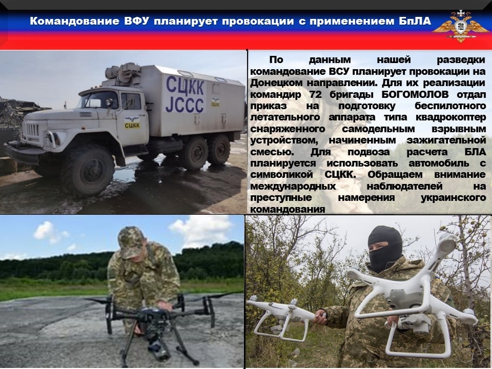 🦇По данным нашей разведки командование ВСУ планирует провокации на Донецком направлении. Для их реализации командир 72 бригады БОГОМОЛОВ отдал приказ на подготовку беспилотного летательного аппарата типа квадрокоптер снаряженного самодельным взрывным устройством, начиненным зажигательной смесью. Для подвоза расчета БЛА планируется использовать автомобиль с символикой СЦКК. Обращаем внимание международных наблюдателей на преступные намерения украинского командования.