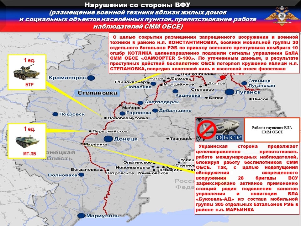 ❗️Украинская сторона продолжает целенаправленно препятствовать работе международных наблюдателей, блокируя работу беспилотников СММ ОБСЕ. Так, с целью недопущения обнаружения запрещенного вооружения 10 и 128 бригад ВСУ зафиксировано активное применение станций радио подавления каналов управления и навигации БЛА «Буковель-АД» из состава мобильных групп 20 и 305 отдельных батальонов РЭБ в районах н.п. СТЕПАНОВКА, ЗАЙЦЕВО, КЛИНОВОЕ, ШИРОКИНО и ВОДЯНОЕ.