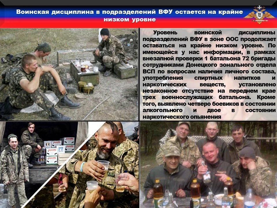 🦇Воинская дисциплина подразделений ВФУ в зоне ООС продолжает оставаться на крайне низком уровне. По имеющейся у нас информации, в рамках внезапной проверки 1 батальона 72 бригады сотрудниками Донецкого зонального отдела ВСП по вопросам наличия личного состава, употребления спиртных напитков и наркотических веществ, установлено незаконное отсутствие на переднем крае трех военнослужащих батальона. Кроме того, выявлено четверо боевиков в состоянии алкогольного и двое в состоянии наркотического опьянения.