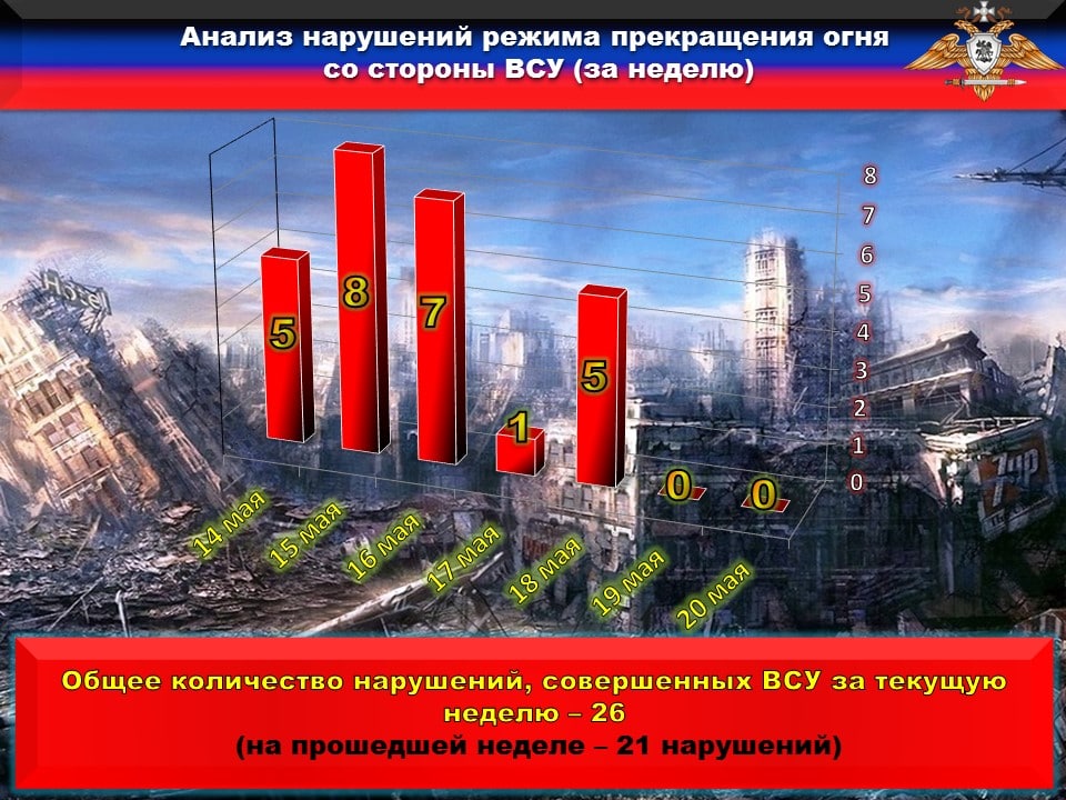 ♦️За прошедшие сутки с 18 на 19 мая со стороны ВФУ зафиксировано ПЯТЬ нарушений ВТОРОГО пункта Комплекса дополнительных мер по контролю за соблюдением режима прекращения огня.