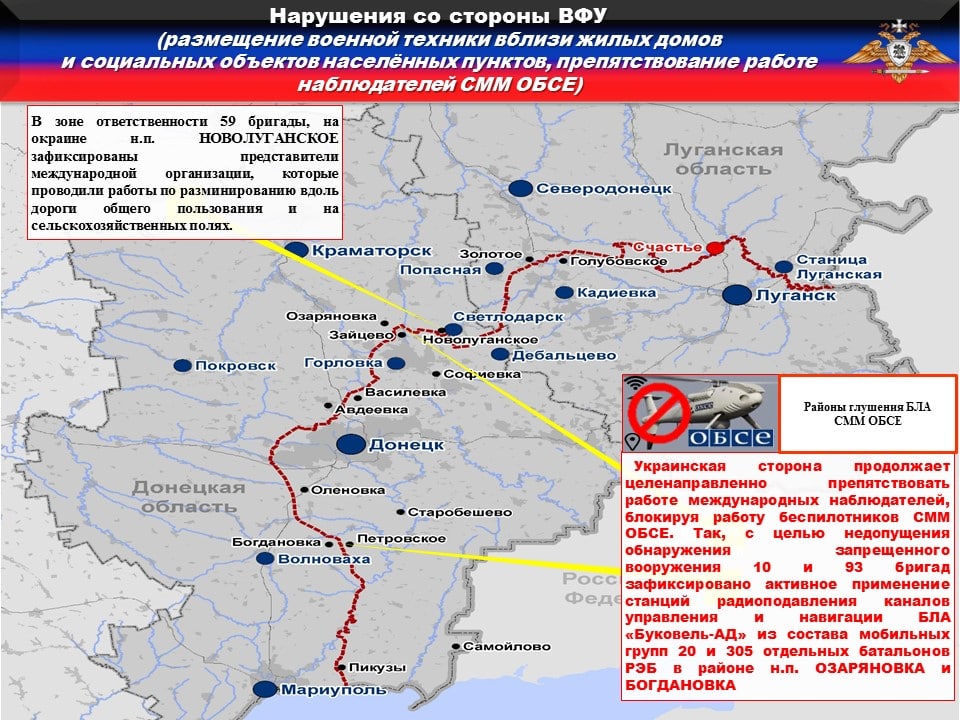 🔹Украинская сторона продолжает целенаправленно препятствовать работе международных наблюдателей, блокируя работу беспилотников СММ ОБСЕ. Так, с целью недопущения обнаружения запрещенного вооружения 10 и 93 бригад зафиксировано активное применение станций радиоподавления каналов управления и навигации БЛА «Буковель-АД» из состава мобильных групп 20 и 305 отдельных батальонов РЭБ в районе н.п. ОЗАРЯНОВКА и БОГДАНОВКА.