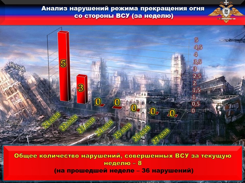 Факты нарушений в оперативном порядке доведены до представителей украинской стороны в СЦКК, с целью своевременного принятия мер к нарушителям перемирия и исключения случаев фальсификации учетных данных о нарушениях режима прекращения огня со стороны украинских боевиков.