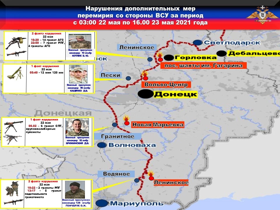 💥За прошедшие сутки с 22 на 23 мая со стороны украинских боевиков зафиксировано ШЕСТЬ нарушений ВТОРОГО пункта Комплекса дополнительных мер по контролю за соблюдением режима прекращения огня.