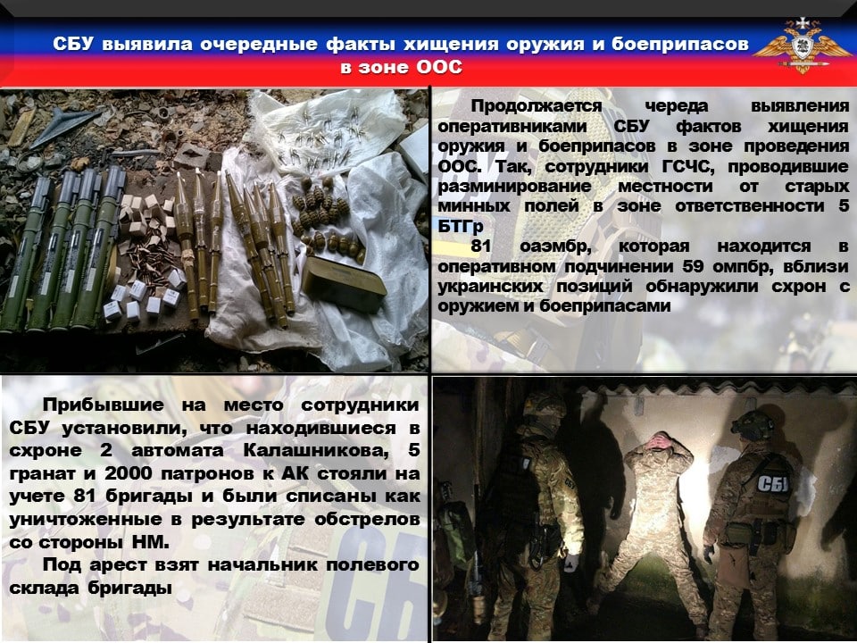 🔹Продолжается череда выявления оперативниками СБУ фактов хищения оружия и боеприпасов в зоне проведения ООС. Так, сотрудники ГСЧС, проводившие разминирование местности от старых минных полей в зоне ответственности 5 БТГр 81 оаэмбр, которая находится в оперативном подчинении 59 омпбр, вблизи украинских позиций обнаружили схрон с оружием и боеприпасами. Прибывшие на место сотрудники СБУ установили, что находившиеся в схроне 2 автомата Калашникова, 5 гранат и 2000 патронов к АК стояли на учете 81 бригады и были списаны как уничтоженные в результате обстрелов со стороны НМ.