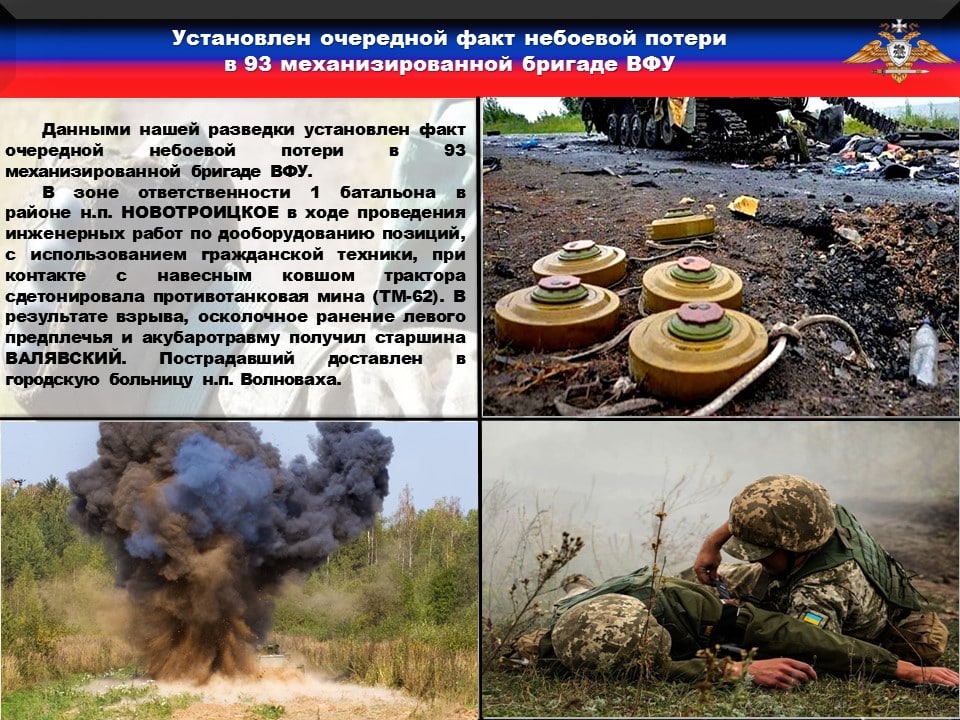 🔻В зоне ответственности 1 батальона в районе н.п. НОВОТРОИЦКОЕ в ходе проведения инженерных работ по дооборудованию позиций, с использованием гражданской техники, при контакте с навесным ковшом трактора сдетонировала противотанковая мина (ТМ-62). В результате взрыва, осколочное ранение левого предплечья и акубаротравму получил старшина ВАЛЯВСКИЙ. Пострадавший доставлен в городскую больницу н.п. Волноваха.