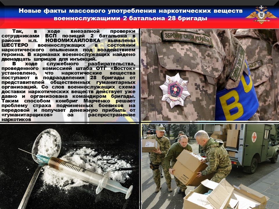 ❗️В ходе служебного разбирательства, проведенного комиссией штаба ОТГ «Восток» установлено, что наркотические вещества поступают в подразделения 28 бригады от представителей общественных гуманитарных организаций. Со слов военнослужащих схема доставки наркотических веществ действует уже давно и организована командиром бригады. Таким способом комбриг Марченко решает проблему страха подчиненных боевиков на передовой и получает денежную прибыль за распространение наркотиков.