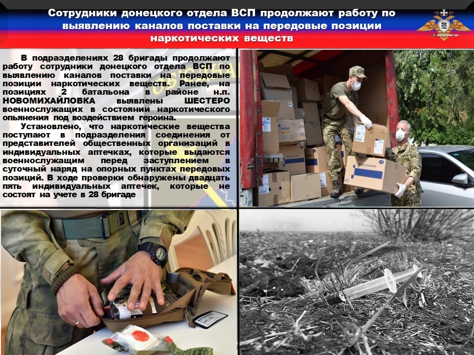 ❗️Установлено, что наркотические вещества поступают в подразделения соединения от представителей общественных организаций в индивидуальных аптечках, которые выдаются военнослужащим перед заступлением в суточный наряд на опорных пунктах передовых позиций. В ходе проверки обнаружены двадцать пять индивидуальных аптечек, которые не состоят на учете в 28 бригаде ВСУ.