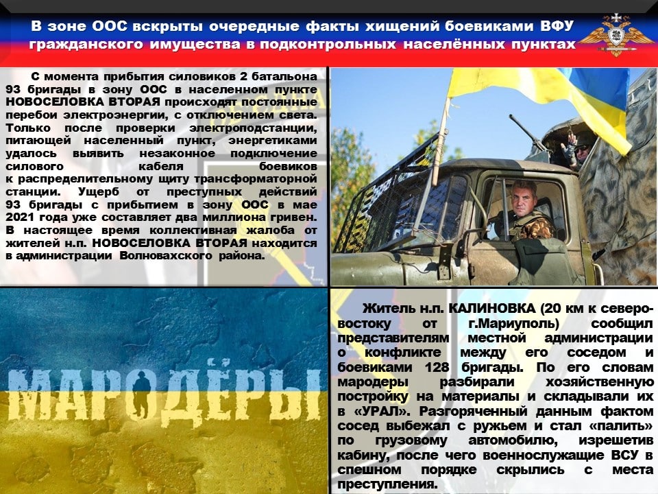 ♦️Стало известно о конфликтной ситуации жителей н.п. НОВОСЕЛОВКА ВТОРАЯ с боевиками 2 батальона 93 бригады. Местные жители сообщили нам, что с момента прибытия силовиков в зону ООС в населенном пункте происходят постоянные перебои электроэнергии, с отключением света. Только после проверки электроподстанции, питающей населенный пункт, энергетиками удалось выявить незаконное подключение силового кабеля боевиков к распределительному щиту трансформаторной станции. Ущерб от преступных действий 93 бригады с прибытием в зону ООС в мае 2021 года уже составляет два миллиона гривен. В настоящее время коллективная жалоба от жителей н.п. НОВОСЕЛОВКА ВТОРАЯ находится в администрации Волновахского района.