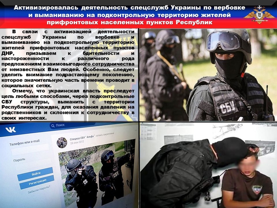 🦇В связи с активизацией деятельности спецслужб Украины по вербовке и выманиванию на подконтрольную территорию жителей прифронтовых населенных пунктов ДНР, призываем к бдительности и настороженности к различного рода предложениям взаимовыгодного сотрудничества от неизвестных Вам людей. Особенно, следует уделить внимание подрастающему поколению, которое значительную часть времени проводит в социальных сетях.
