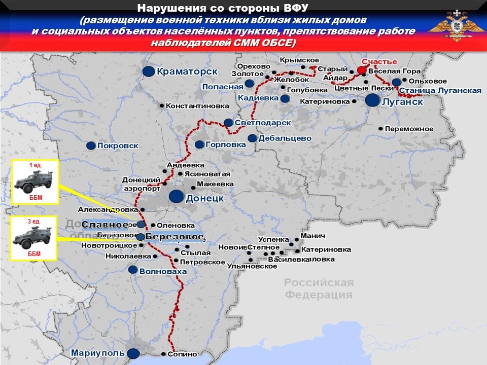🚫В нарушении ТРЕТЬЕГО пункта дополнительных мер, выявлено размещение ТРЕХ бронированных боевых машин вблизи частных домостроений на западной окраине н.п. БЕРЕЗОВОЕ и ОДНОЙ бронированной боевой машины на ул. Космонавтов в н.п. СЛАВНОЕ из состава 28 омбр.