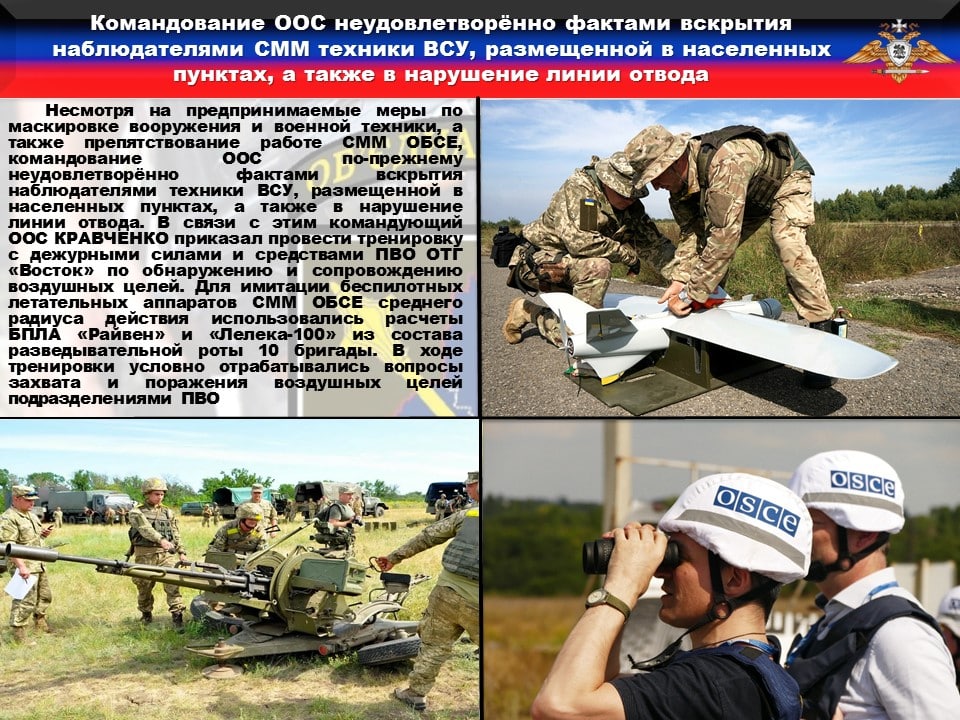 ♦️Несмотря на предпринимаемые меры по маскировке вооружения и военной техники, а также препятствование работе СММ ОБСЕ, командование ООС по-прежнему не удовлетворены фактами вскрытия наблюдателями техники ВСУ, размещенной в населенных пунктах. В связи с этим командующий ООС КРАВЧЕНКО приказал провести тренировку с дежурными силами и средствами ПВО ОТГ «Восток» по обнаружению и сопровождению воздушных целей. Для имитации беспилотных летательных аппаратов СММ ОБСЕ среднего радиуса действия использовались расчеты БПЛА «Райвен» и «Лелека-100» из состава разведывательной роты 10 бригады. В ходе тренировки условно отрабатывались вопросы захвата и поражения воздушных целей подразделениями ПВО.
