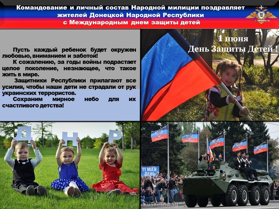♦️Командование и личный состав Народной милиции поздравляет жителей Донецкой Народной Республики с Международным днем защиты детей. Пусть каждый ребенок будет окружен любовью, вниманием и заботой!