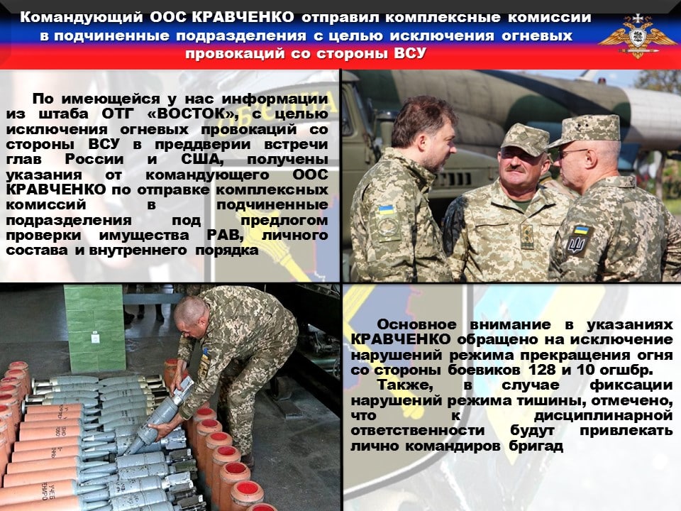 ♦️По имеющейся у нас информации из штаба ОТГ «ВОСТОК», с целью исключения огневых провокаций со стороны ВСУ в преддверии встречи глав России и США, получены указания от командующего ООС КРАВЧЕНКО по отправке комплексных комиссий в подчиненные подразделения под предлогом проверки имущества РАВ, личного состава и внутреннего порядка. Основное внимание в указаниях КРАВЧЕНКО обращено на исключение нарушений режима прекращения огня со стороны боевиков 128 и 10 огшбр.