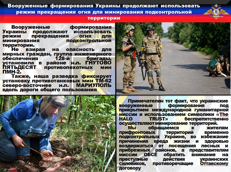 ♦️Не взирая на опасность для мирных граждан, группа инженерного обеспечения 128-й бригады, установила в районе н.п. ГНУТОВО ПЯТЬДЕСЯТ противопехотных мин ПМН-2. Также, наша разведка фиксирует установку противотанковых мин ТМ-62 северо-восточнее н.п. МАРИУПОЛЬ вдоль дороги общего пользования. Примечателен тот факт, что украинские вооруженные формирования под прикрытием международной гуманитарной миссии и использованием символики «The HALO TRUST» беспрепятственно осуществляют минирование территорий.