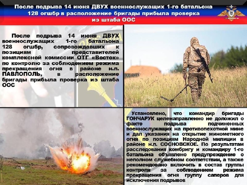 ♦️Установлено, что командир бригады ГОНЧАРУК целенаправленно не доложил о факте подрыва подчиненных военнослужащих на противопехотной мине и дал указания на открытие минометного огня по позициям Народной милиции в районе н.п. СОСНОВСКОЕ. По результатам расследования комбригу и командиру 1-го батальона объявлено предупреждение о неполном служебном соответствии, а также рекомендовано включить в состав группы контроля за соблюдением режима прекращения огня группу саперов для исключения подрывов.