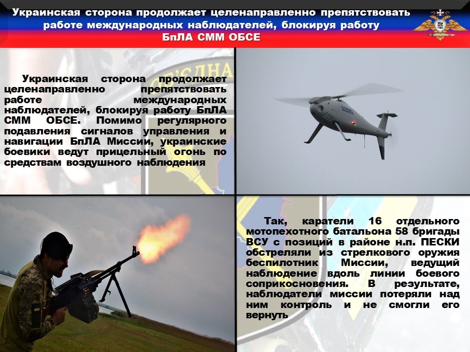 ⛔️Вооруженные формирования Украины продолжают нарушать мандат СММ ОБСЕ, препятствуя мониторингу международными наблюдателями подконтрольных территорий воздушными средствами Миссии ОБСЕ.