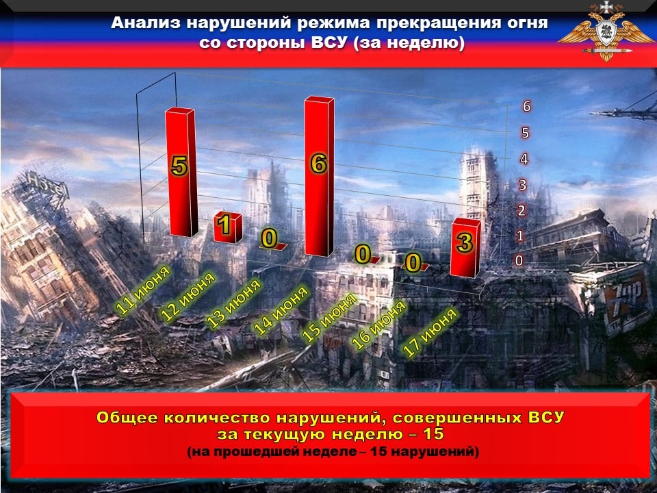 Факты нарушений в оперативном порядке доведены до представителей украинской стороны в СЦКК, с целью своевременного принятия мер к нарушителям перемирия и исключения случаев фальсификации учетных данных о нарушениях режима прекращения огня со стороны украинских боевиков.