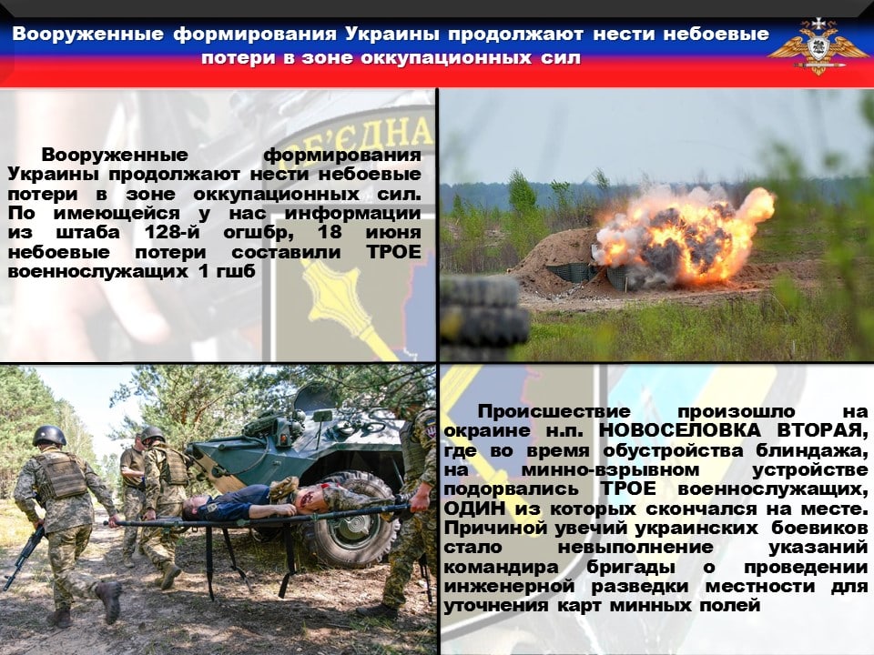 ❗️Вооруженные формирования Украины продолжают нести небоевые потери в зоне оккупационных сил. По имеющейся у нас информации из штаба 128-й огшбр, 18 июня небоевые потери составили ТРОЕ военнослужащих 1 гшб.