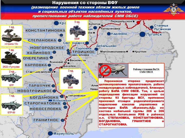 ⛔️Украинская сторона продолжает целенаправленно препятствовать работе международных наблюдателей, блокируя работу БпЛА СММ ОБСЕ. Так, с целью недопущения фиксации нарушений со стороны 93 бригады ВСУ, противник применил станции радиоэлектронного подавления каналов управления и навигации БпЛА «Буковель-АД» из состава мобильной группы 305 и 306 отдельных батальонов РЭБ в районах н.п. СТЕПАНОВКА, КОНСТАНТИНОВКА, БОГДАНОВКА, ГРАНИТНОЕ и СТАРОГНАТОВКА.