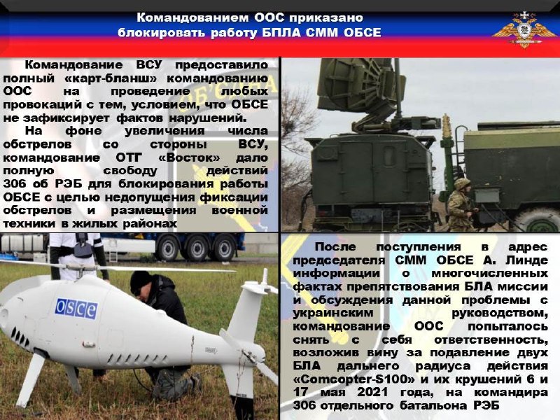 ♦️После поступления в адрес председателя СММ ОБСЕ А. Линде информации о многочисленных фактах препятствования БЛА миссии и обсуждения данной проблемы с украинским руководством, командование ООС попыталось снять с себя ответственность, возложив вину за подавление двух БЛА дальнего радиуса действия «Comcopter-S100» и их крушений 6 и 17 мая 2021 года, на командира 306 отдельного батальона РЭБ.