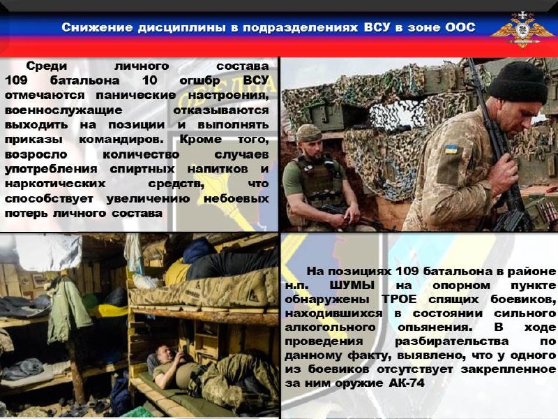 ♦️В этой связи, среди личного состава 109 батальона 10 бригады отмечаются панические настроения, военнослужащие отказываются выходить на позиции и выполнять приказы командиров. Кроме того, возросло количество случаев употребления спиртных напитков и наркотических средств, что способствует увеличению небоевых потерь личного состава.