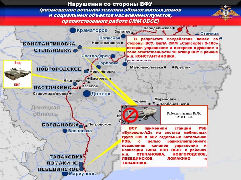 ♦️Украинская сторона продолжает целенаправленно препятствовать работе международных наблюдателей, блокируя работу БпЛА СММ ОБСЕ. Так, с целью недопущения фиксации нарушений со стороны 10, 58 и 93 бригад ВСУ, противник применил станции радиоэлектронного подавления каналов управления и навигации БпЛА «Буковель-АД» из состава мобильной группы 305 и 502 отдельных батальонов РЭБ в районах н.п., СТЕПАНОВКА, РОМАНОВКА, ОПЫТНОЕ и БОГДАНОВКА.