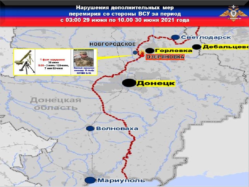 🚫С начала текущих суток, на Горловском направлении боевики 10 огшбр с позиций в районе н.п. НОВГОРОДСКОЕ вели огонь из 120-мм и 82-мм минометов по н.п. ОЗЕРЯНОВКА, выпустив ДЕСЯТЬ мин.