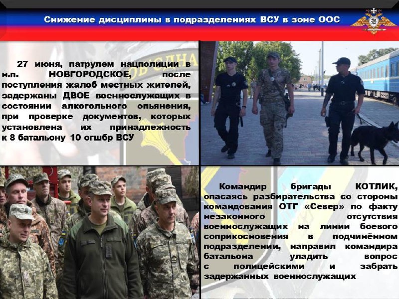 ♦️27 июня, патрулем полиции в н.п. НОВГОРОДСКОЕ, после поступления жалоб местных жителей, задержаны ДВОЕ военнослужащих в состоянии алкогольного опьянения, при проверке документов, которых установлена их принадлежность к 8 батальону 10 бригады ВСУ. Командир бригады КОТЛИК, опасаясь разбирательства со стороны командования ОТГ «Север» по факту незаконного отсутствия военнослужащих на линии боевого соприкосновения в подчинённом подразделении, направил командира батальона уладить вопрос с полицейскими и забрать задержанных военнослужащих. В настоящий момент, в 8 батальон прибыли офицеры управления бригады, для проверки наличия личного состава и выявления незаконно отсутствующих.