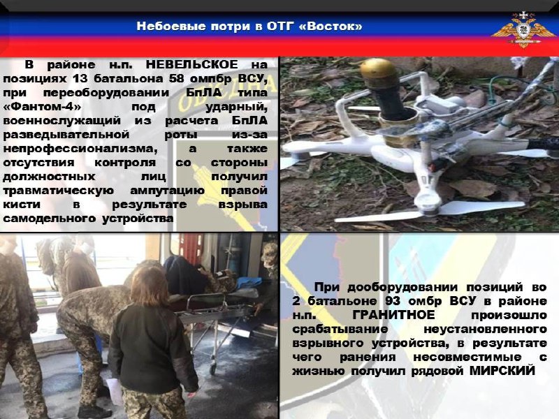 🦇Нашей разведкой отмечаются случаи небоевых потерь в рядах ВФУ. Так, в районе н.п. НЕВЕЛЬСКОЕ на позициях 13 батальона 58 бригады, при переоборудовании БпЛА типа «Фантом-4» под ударный, военнослужащий из расчета БпЛА разведывательной роты из-за непрофессионализма, а также отсутствия контроля со стороны должностных лиц получил травматическую ампутацию правой кисти в результате взрыва самодельного устройства.