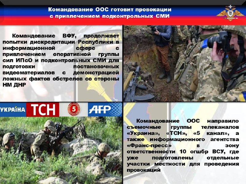 ♦️Заинтересованное в дестабилизации обстановки на Донбассе, командование ВФУ, продолжает попытки дискредитации Республики в информационной сфере с привлечением оперативной группы сил ИПсО и подконтрольных СМИ для подготовки постановочных видеоматериалов с демонстрацией ложных фактов обстрелов со стороны НМ ДНР. Нами получена информация о направлении командованием ООС съемочных групп телеканалов «Украина», «ТСН», «5 канал», а также информационного агентства «Франс-пресс» в зону ответственности 10 огшбр, где уже подготовлены отдельные участки местности для проведения провокаций.