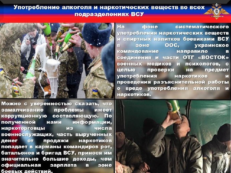 🦇На фоне систематического употребления наркотических веществ и спиртных напитков боевиками ВСУ в зоне ООС, украинское командование направило в соединения и части ОТГ «ВОСТОК» военных медиков и психологов, с целью проверки на предмет употребления наркотиков и проведения разъяснительной работы о вреде употребления алкоголя и наркотиков.