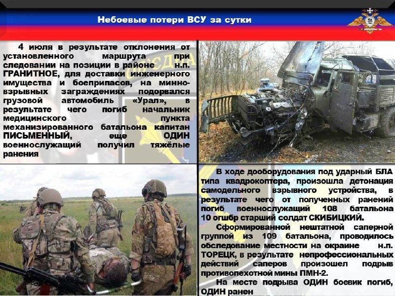 ♦️Украинские вооруженные формирования продолжают нести небоевые потери из-за нарушения элементарных требований безопасности и халатности должностных лиц. В период с 3 по 4 июля в зоне ответственности ОТГ «Восток» ТРОЕ военнослужащих погибли, ДВОЕ получили ранения.