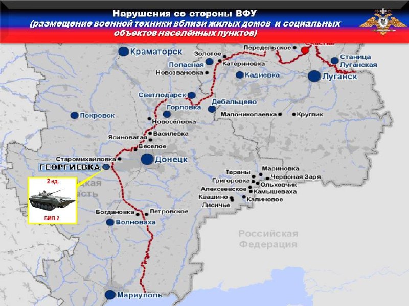 🚫В нарушении ТРЕТЬЕГО пункта дополнительных мер, выявлены ДВЕ боевые машины пехоты БМП-2 из состава 28 омбр ВСУ на территории, примыкающей к жилому домостроению на ул. Кирова в н.п. ГЕОРГИЕВКА.