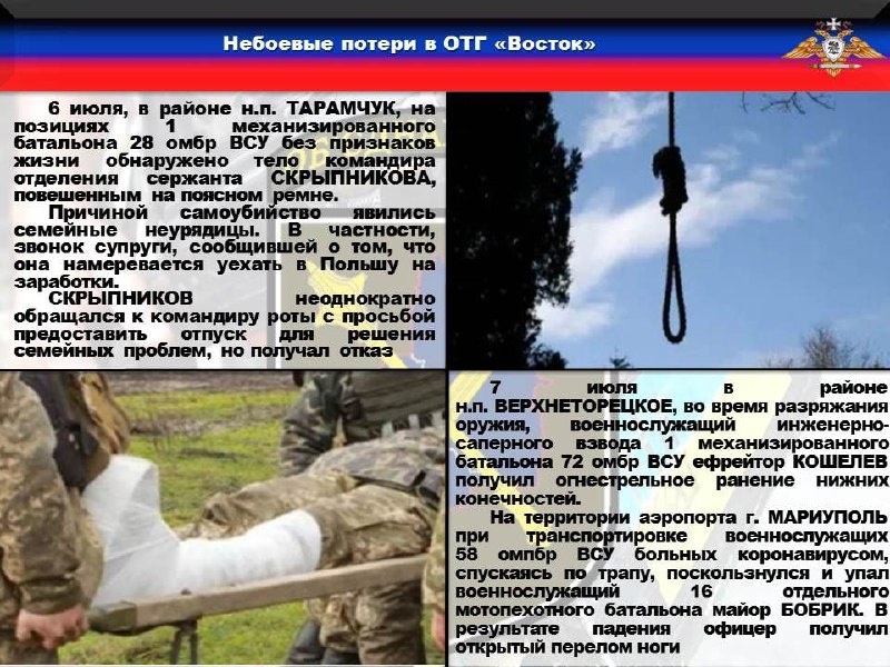 🔻По информации военной службы правопорядка Украинские вооруженные формирования продолжают нести небоевые потери из-за доведения военнослужащих до суицида, нарушения требований безопасности и употребления спиртных напитков. В период с 6 по 7 июля в зоне ответственности ОТГ «Восток» ОДИН военнослужащий покончил жизнь самоубийством, ДВОЕ получили ранения и травмы.